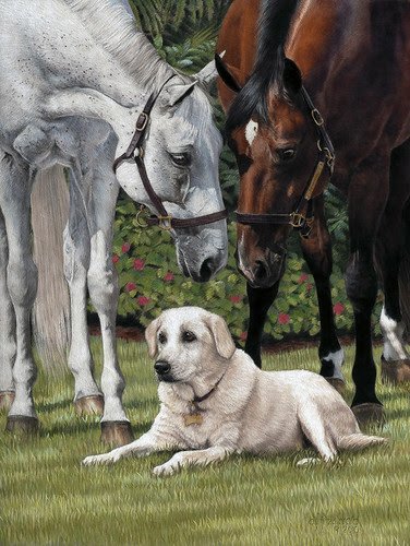 This is a progression I did of 2 horses and a dog. I photographed the horses in Tryon, N.C. and the dog in Wellington, Fl.. Unfortunately, the dog, Magnolia, had to be put to sleep a couple of weeks after the photos were taken. Very sad! She was dearly loved. I tried to get this done in a record 4 days... not to be! I took the progression photos to help me keep going. I did 2 "almost all nighters"... I am really getting to old for those!! I had down loaded some great new music (Joe Bonamassa!!! WOW!!! Blues guitarist... amazing!) onto my Ipod and rocked the nights away... but it still did not get done!! Oh well! I finally have time to get them on my blog. I will down load the photos tomorow.....